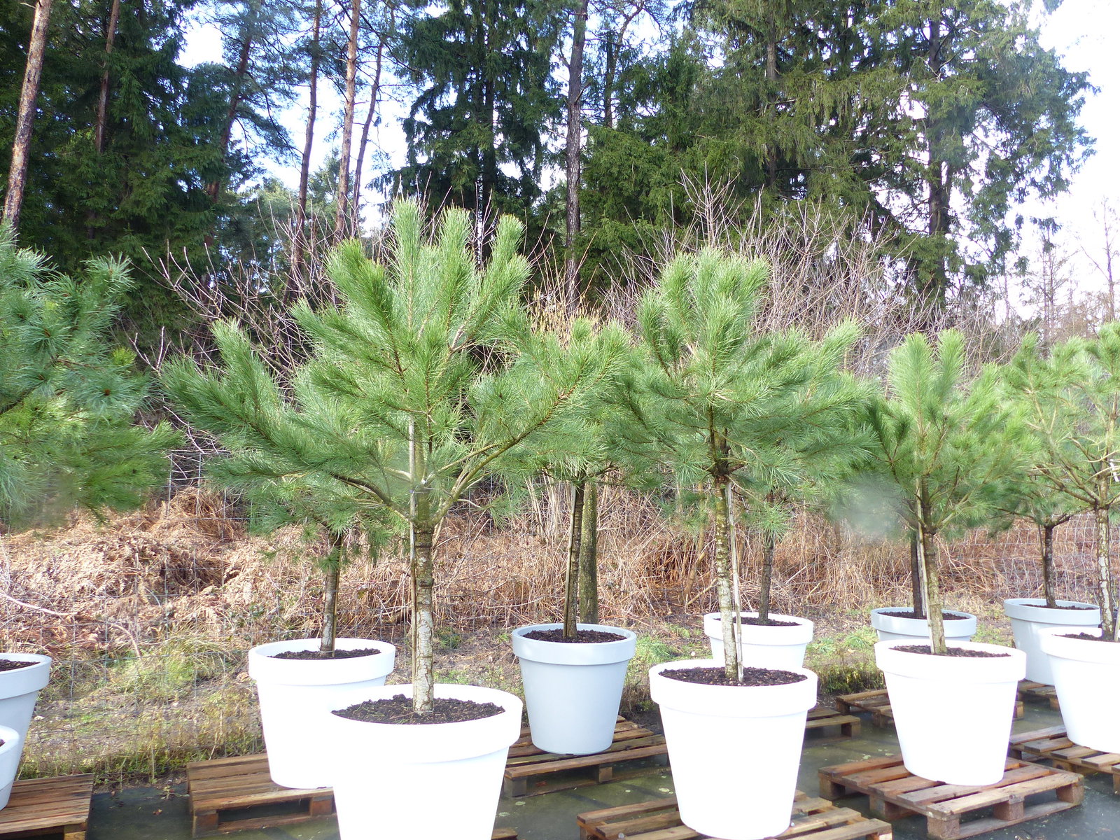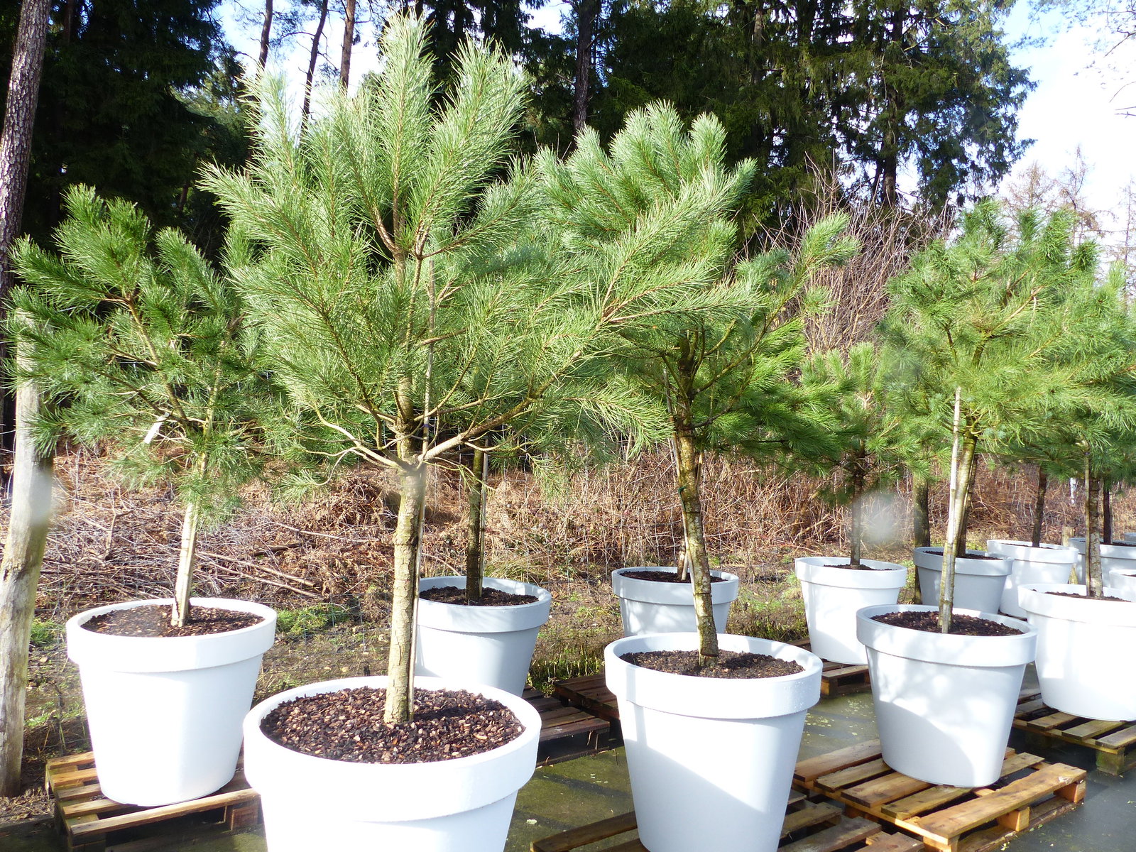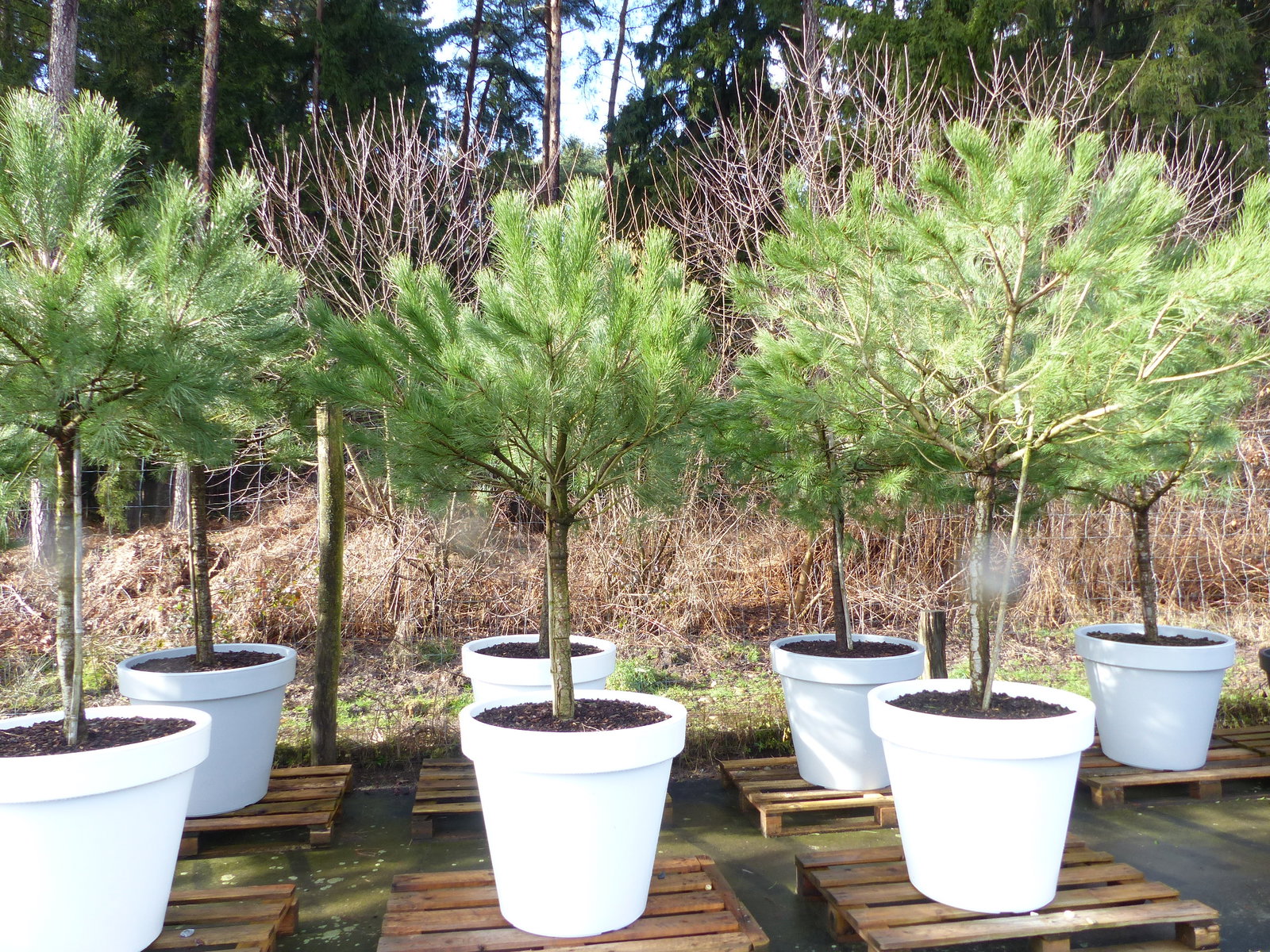 Pinus Pinea Stamm in Premiumqualität inkl. 80 cm Pflanzkübel aus PE in weiß