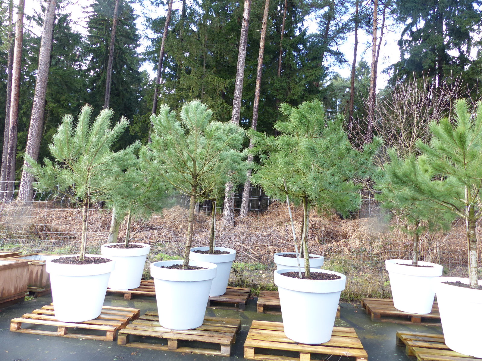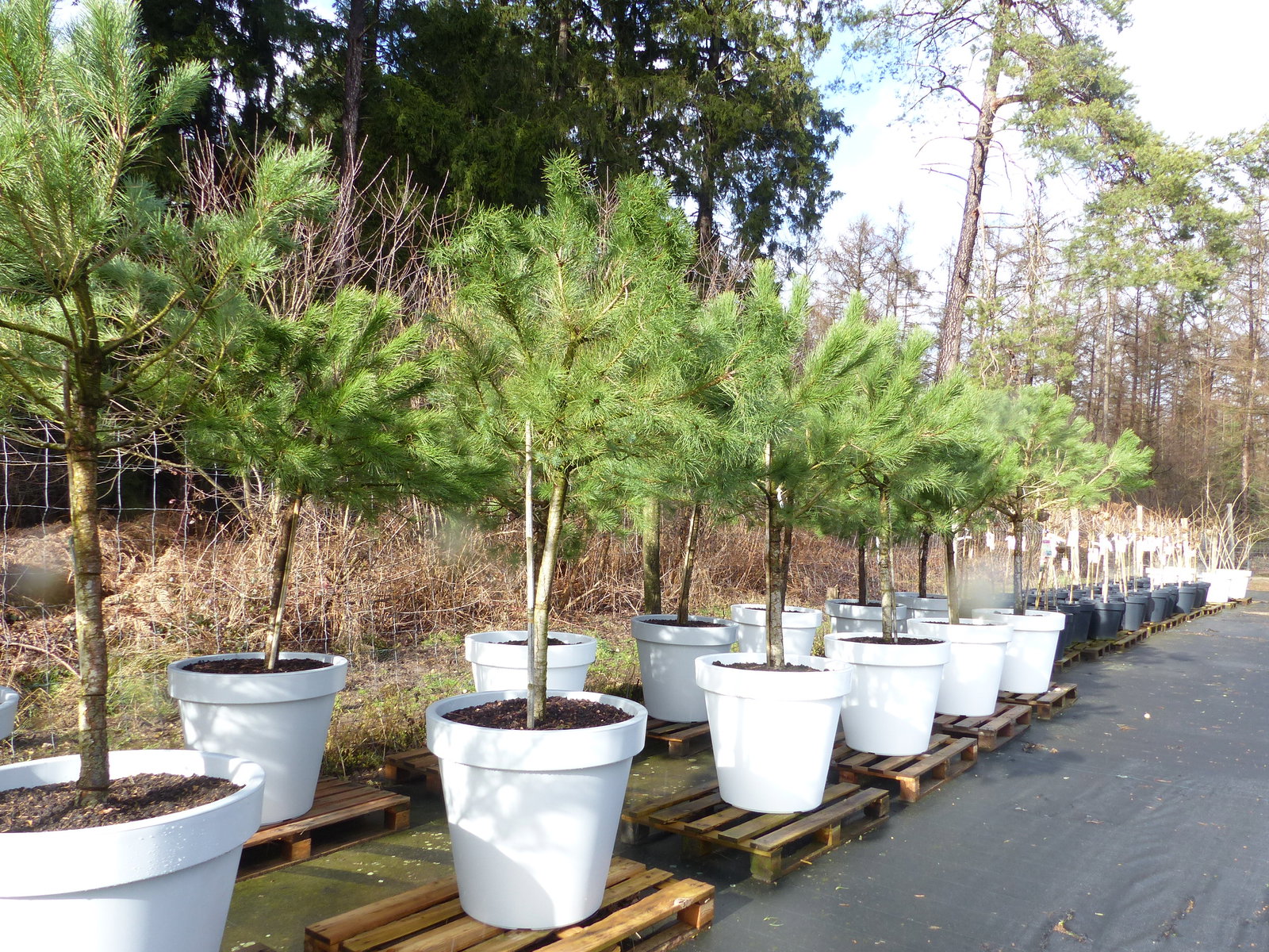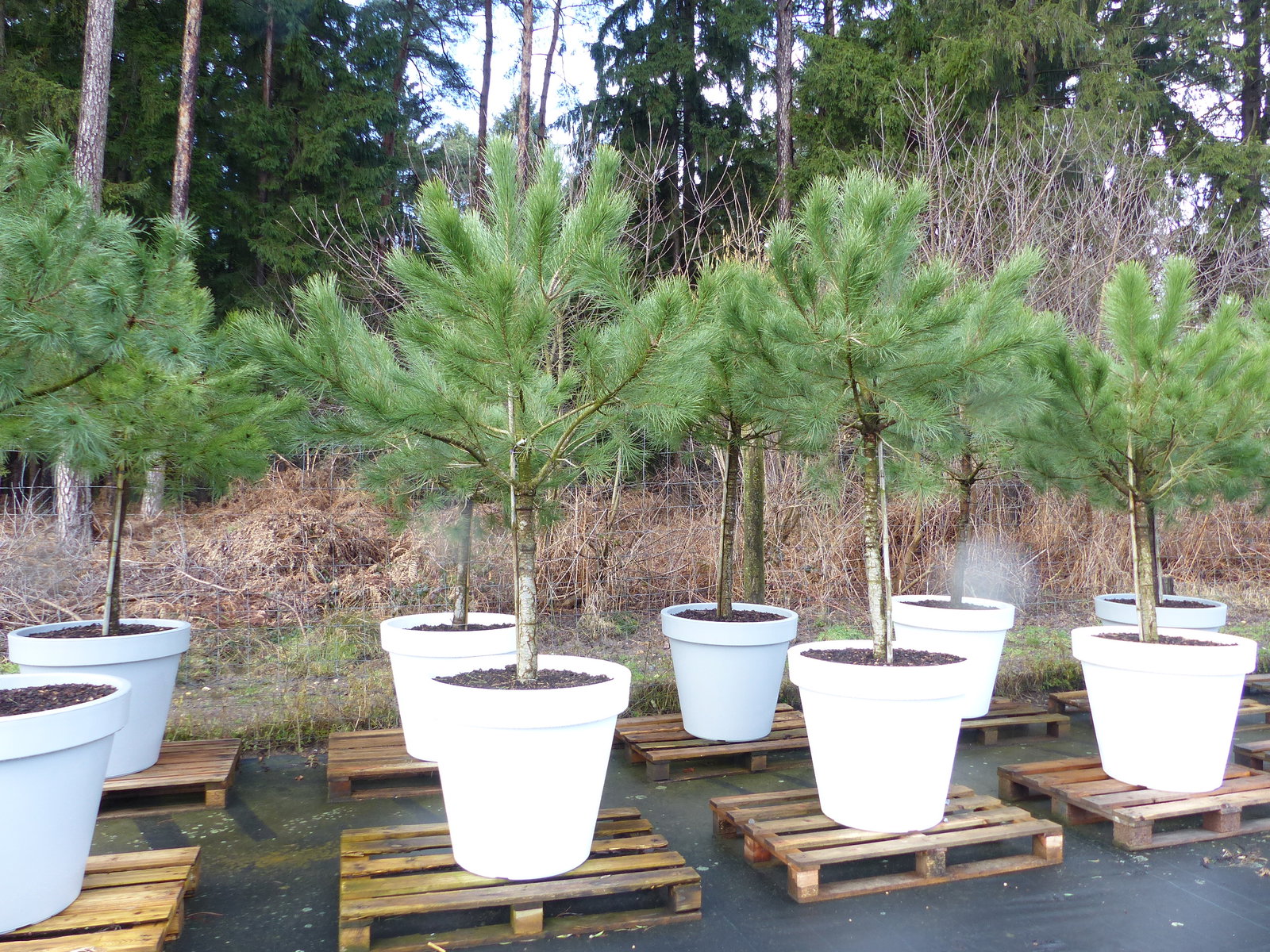 Pinus Pinea Stamm in Premiumqualität inkl. 80 cm Pflanzkübel aus PE in weiß